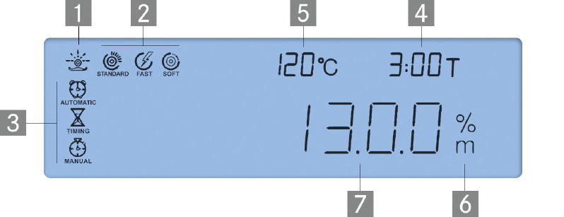 Taustavalaistu, graafinen näyttö näyttää (kts. näyttökuva): aktiivisen kuivausprosessin (1), aktiivisen lämmitysprofiilin (2), aktiivisen sammutuskriteerin (3), edellisen kuivumisajan (4), tämänhetkisen lämpötilan (5), tämänhetkisen kosteuspitoisuuden %:ssa (6).