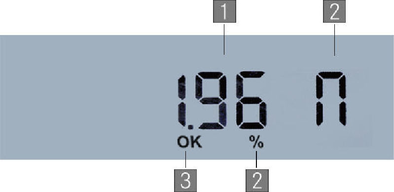 Taustavalaistu LCD-näyttö näyttää (kts. näyttökuva): tämänhetkisen kosteuspitoisuuden %:ssa (1), saadun tuloksen yksikön (2), aktiivisen kuivumisprosessin (3).