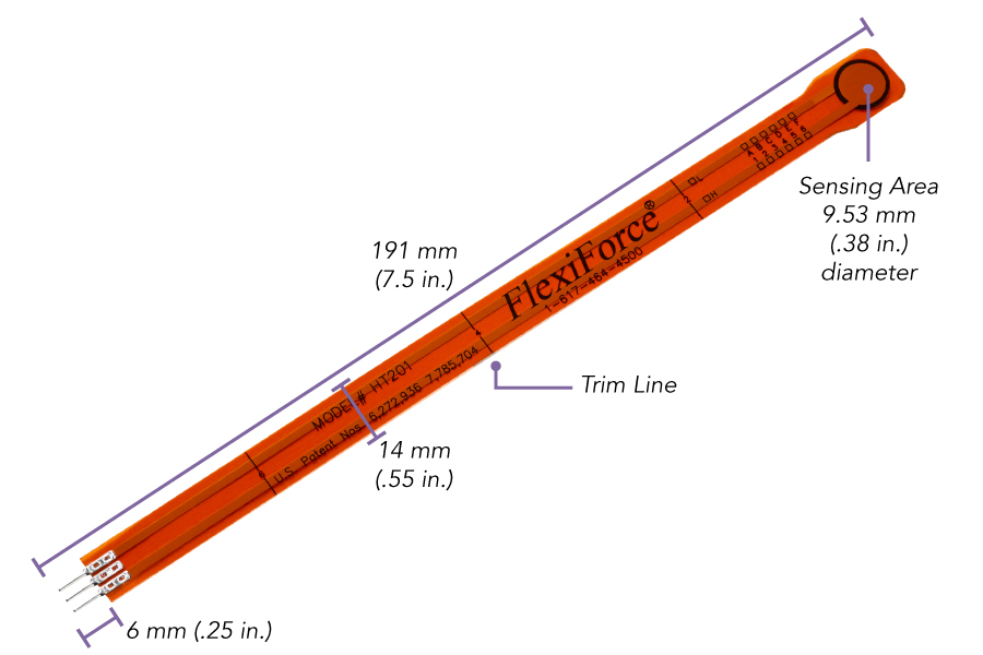 Tämä 3-napainen Tekscan Flexiforce HT201 anturi mittaa voimaa ja painetta kohteissa, joiden lämpötila on jopa 200 °C. HT201 mittaa standardivoiman 222 N (50 lb) sekä maksimaalisen voiman 2 224 N (lue lisää aiheeseen liittyen alta löytyvästä tiedostosta ”Electrical integration”).