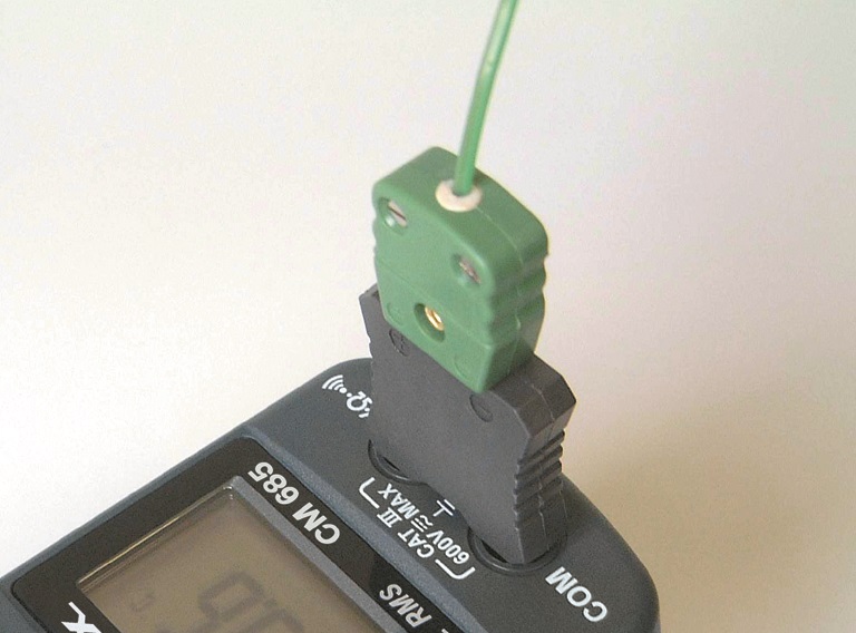 Övergångar med cc 19 mm bananingång för inkoppling i multimetrar och strömtänger med termoelement typ K eller Pt 100/Pt 1000 ingång mellan V och COM ingången på instrumentet.
